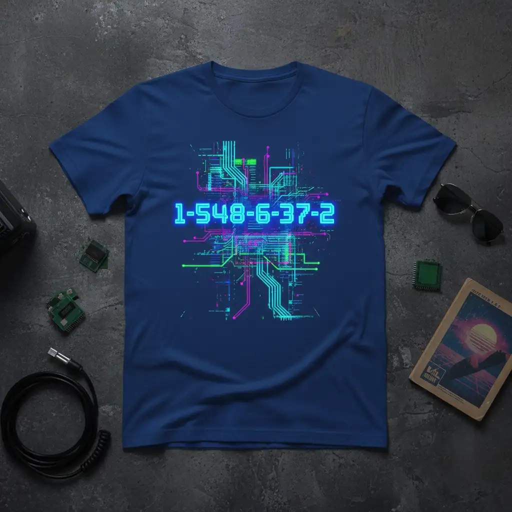 1-548-6-37-2 is more than just a sequence of numbers; it’s a statement piece for the digitally inclined. This t-shirt design captures the essence of technology with its intricate circuit board pattern and vibrant, glowing numerals. It’s a perfect fusion of abstract art and digital culture, appealing to coders, gamers, and anyone who appreciates the beauty of complex systems. Wear your passion for technology proudly and let this unique design spark conversations.