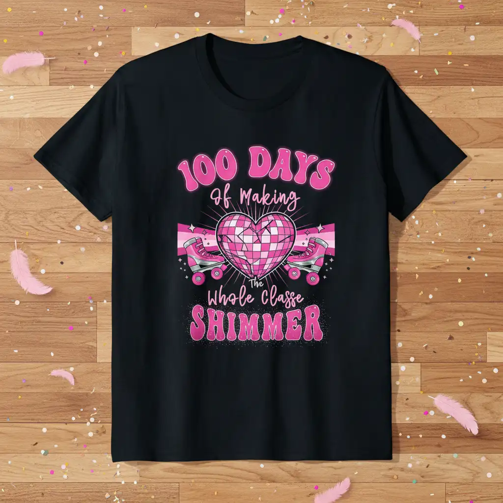 This design is perfect for teachers who want to make the 100th-day celebration memorable or for students who are proud of their progress. The playful imagery, including roller skates and a shimmering disco heart, adds a touch of fun and excitement, making it a delightful addition to any school event or casual wear.