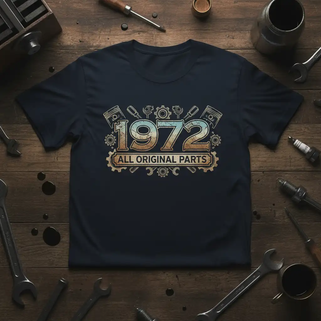 This exclusive t-shirt celebrates the unique spirit of anyone born in 1972, proclaiming them “All Original Parts.” This 1972 All Original Parts design features a bold, vintage-inspired font for the year, complemented by intricate graphics of pistons, gears, and wrenches that signify automotive excellence and mechanical prowess. It’s a statement piece that resonates with car enthusiasts, mechanics, and anyone who cherishes their birth year with a sense of pride and authenticity. This tee is perfect for casual wear, car shows, or as a memorable birthday gift.