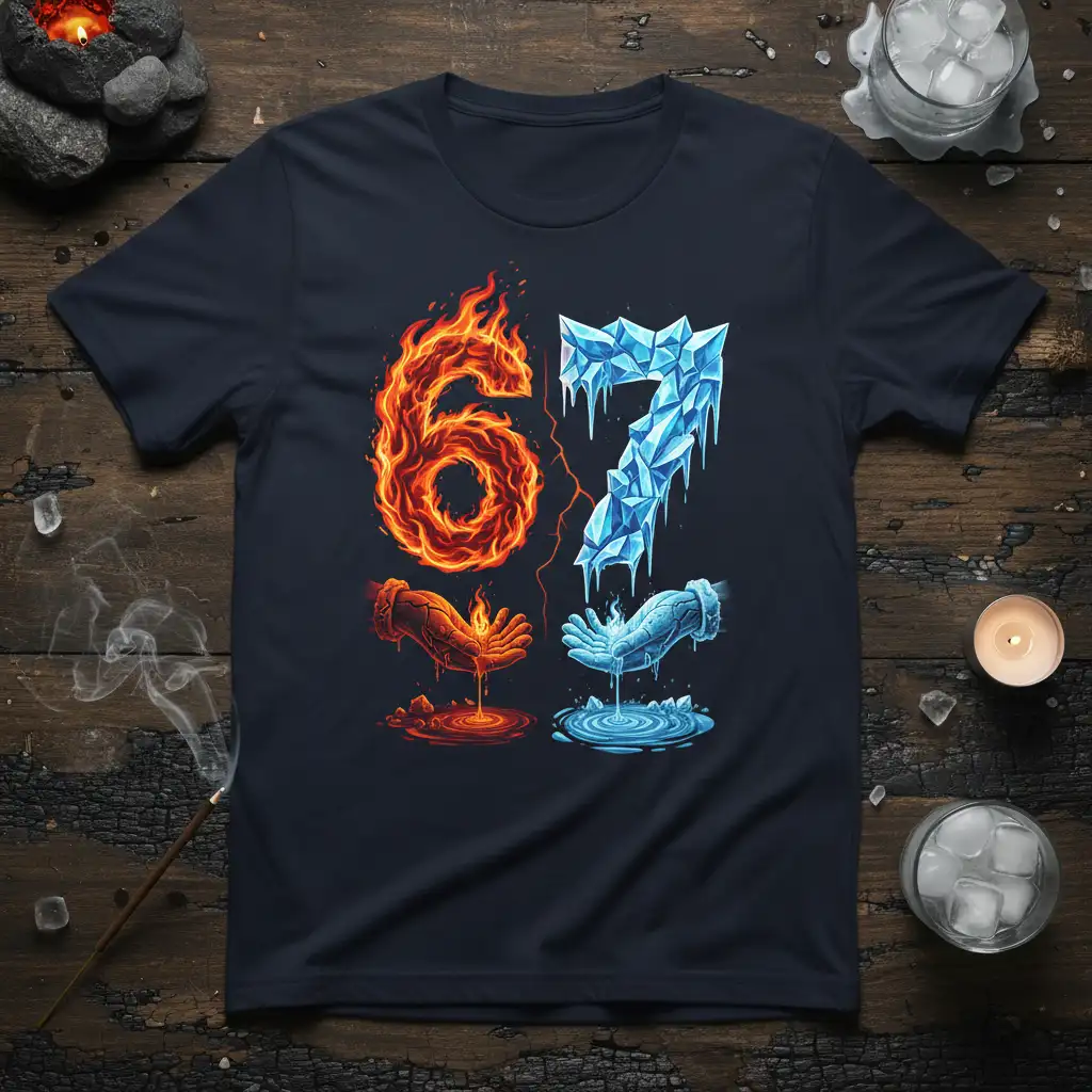 This unique t-shirt design masterfully captures the essence of opposing elements, featuring the numbers 6 and 7 brought to life through fire and ice. The fiery ‘6’ crackles with vibrant orange and red hues, while the icy ‘7’ shimmers with cool blues and crystalline textures. Each number is accompanied by a stylized hand, one emerging from molten lava and the other from a pool of water, further emphasizing the elemental theme.