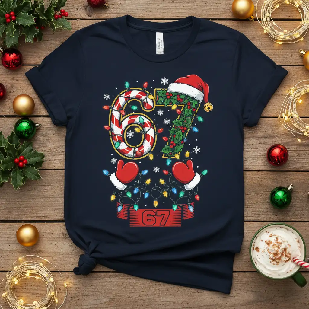 Embrace the holiday spirit with this festive apparel, perfect for any Christmas celebration. The 67 Christmas T-Shirt is designed to bring smiles and holiday cheer to everyone who sees it. Its vibrant colors and detailed graphics make it a standout piece for any winter event or holiday gathering.