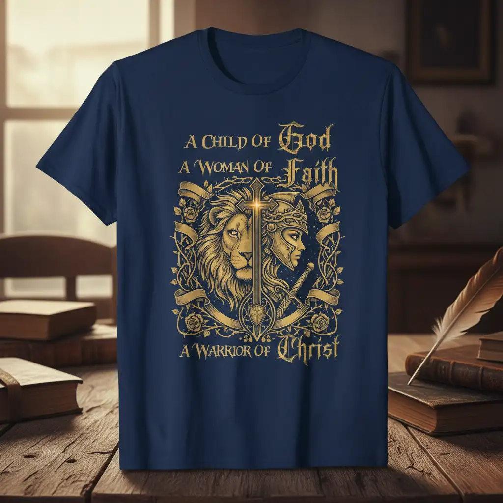This t-shirt powerfully conveys the message of being a spiritual warrior. It highlights the dual nature of faith: a gentle devotion as a child of God and a woman of faith, coupled with the strength and courage of a warrior. The symbolic imagery, featuring a majestic lion and a determined warrior profile, represents the ferocity and grace inherent in a faithful life. This design is intended to empower and uplift, serving as a constant affirmation of one’s spiritual identity and divine connection.