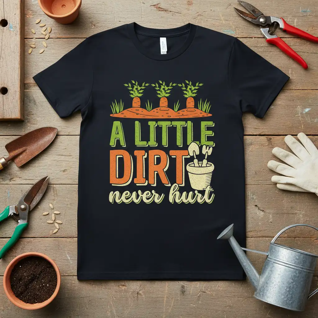 Featuring vibrant graphics that include charming carrots sprouting from the earth and essential gardening tools like a trowel and a pot, this shirt visually represents the rewarding nature of the hobby. This A LITTLE DIRT never hurt design is crafted to be eye-catching and evoke the earthy, wholesome feel of spending time in the garden, making it a delightful piece for any occasion.