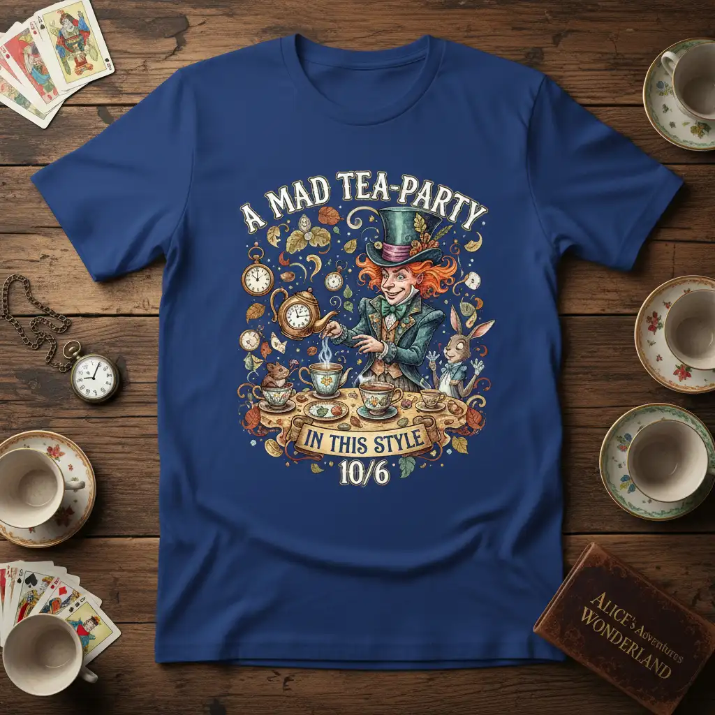 A Mad Tea-Party In This Style 10/6 invites you into a world of delightful absurdity and fantastical charm, directly from the pages of Lewis Carroll’s timeless classic. This t-shirt design captures the essence of the iconic mad tea party, featuring the eccentric Mad Hatter himself in his full glory. It’s more than just apparel; it’s a wearable piece of literary magic, perfect for anyone who cherishes the whimsical and the wonderfully strange. Embrace the spirit of curiosity and adventure with this unique design that celebrates the imaginative world of Wonderland.