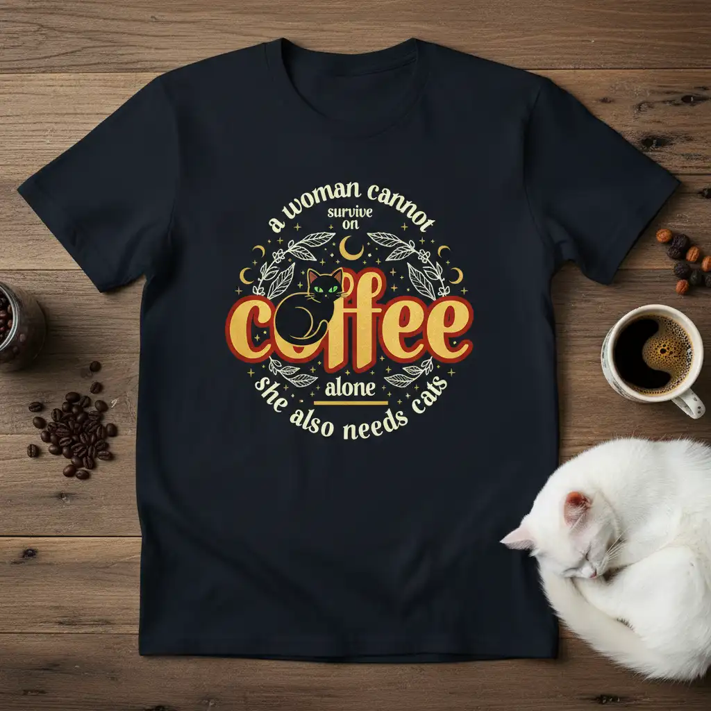 Choose from a selection of classic colors that complement the design and your personal style. Available in Black, Red, Navy, White, Dark Heather, and Royal, there’s a shade to suit every preference. Each color option provides a beautiful backdrop for the intricate graphic, making the “A Woman Cannot Survive On Coffee Alone She Also Needs Cats” message pop.