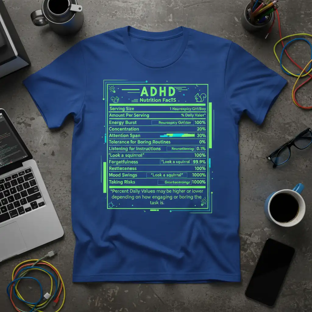 ADHD Nutrition FACTS Serving Size 1 Neuraspicy GiH/Boy % Daily Vales* Amount Per Serving Energy Burst Neurospicy GnlCov 100% Concentration 20% Attention Span 30% Tolerance for Boring Routines 0% Listening for Instructions Neurattiemisp 0.1% “Look a squirrel” 100% Forgetfulness “Look a squirrel” 99.9% Restlessness “Look a squirrel” 100% Mood Swings “Look a squirrel” 1000% Taking Risks Gnuattaemups 1000% *Percent Daily Values may be higher or lower depending on how engaging or boring the task is. – ADHD Nutrition FACTS Serving Size 1 Neuraspicy GiH/Boy % Daily Vales* Amount Per Serving Energy Burst Neurospicy GnlCov 100% Concentration 20% Attention Span 30% Tolerance for Boring Routines 0% Listening for Instructions Neurattiemisp 0.1% “Look a squirrel” 100% Forgetfulness “Look a squirrel” 99.9% Restlessness “Look a squirrel” 100% Mood Swings “Look a squirrel” 1000% Taking Risks Gnuattaemups 1000% *Percent Daily Values may be higher or lower depending on how engaging or boring the task is. This unique t-shirt is designed to resonate with individuals who understand the nuances of living with ADHD. It playfully presents common ADHD traits in the format of a nutrition facts label, offering a humorous and relatable perspective.
