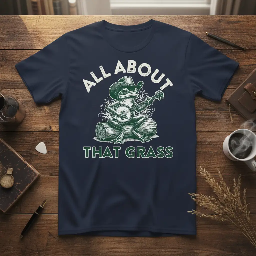 The “All About That Grass” design offers a playful and lighthearted take on country and bluegrass themes. It appeals to a broad audience, from seasoned country music fans to those who simply enjoy quirky and artistic graphics. The combination of the frog, banjo, and cowboy hat creates a narrative that is both humorous and endearing. This shirt is ideal for festivals, casual outings, or just relaxing at home.