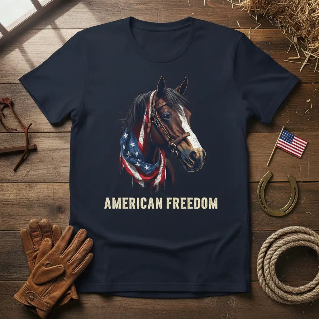 Don’t miss out on the opportunity to own this exceptional AMERICAN FREEDOM t-shirt. It’s more than just clothing; it’s a statement piece that allows you to express your love for your country and your passion for horses. Add this versatile and meaningful tee to your collection today and wear your pride with confidence. Click here to explore our full range and find your perfect fit!