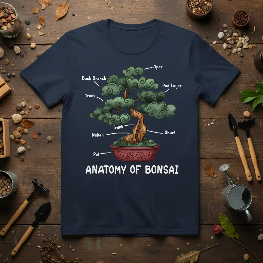 Dive deep into the structure and beauty of these miniature trees with our specially designed t-shirt. The detailed diagram clearly labels essential parts like the Apex, Back Branch, Trunk, Nebari, Pot, Shari, and Pad Layer. This visual guide helps you appreciate the complexity and artistry involved in shaping and maintaining a healthy bonsai.