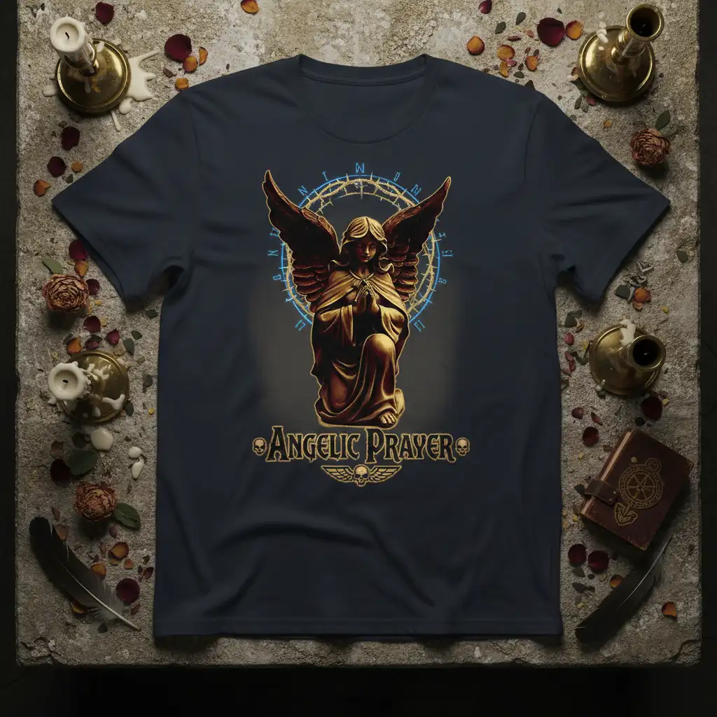 The “Angelic Prayer” text is elegantly presented in a golden, ornate font that complements the divine theme of the design. It speaks to the quiet strength found in prayer and the universal human desire for connection with something greater than oneself. This t-shirt is designed to resonate deeply with individuals who cherish their spiritual journey and wish to carry a piece of that sacred energy with them throughout their day.