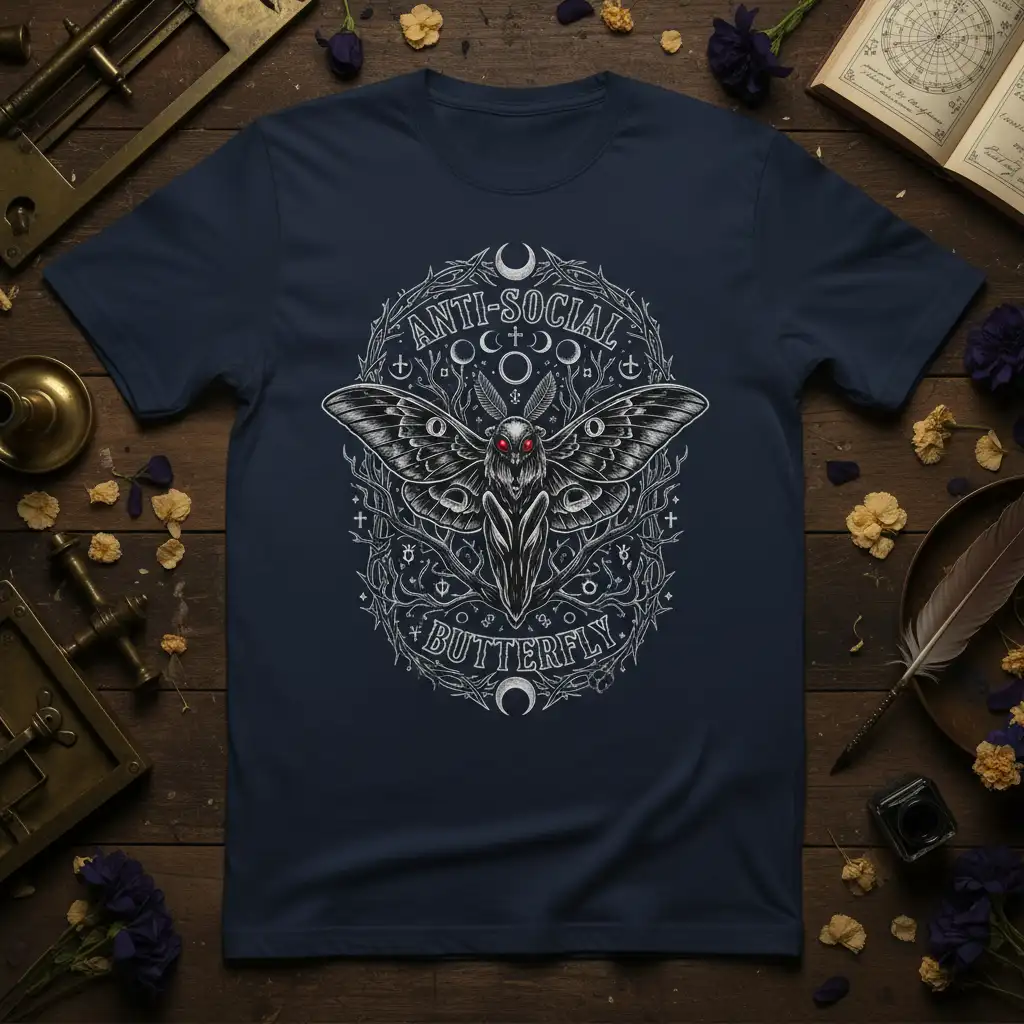 This design embodies the spirit of the Anti-Social Butterfly, celebrating those who find comfort in their own company. The detailed moth graphic, often associated with transformation and the night, is complemented by subtle occult symbols and lunar motifs. This creates a visually striking piece that appeals to fans of gothic, witchy, and dark academia aesthetics. It’s a perfect way to express your individuality and your appreciation for the unconventional.