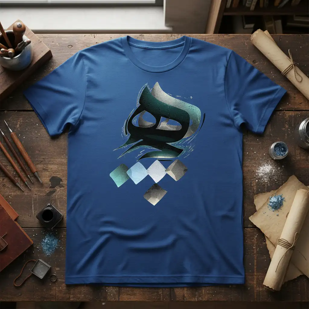 The carefully chosen color palette ensures that the design stands out vibrantly against the deep blue fabric of the t-shirt. The subtle interplay of light and shadow within the lettering creates a sense of depth and movement, further enhancing its artistic appeal. This is a design intended to be admired and appreciated by those who understand the nuanced beauty of Arabic letters.