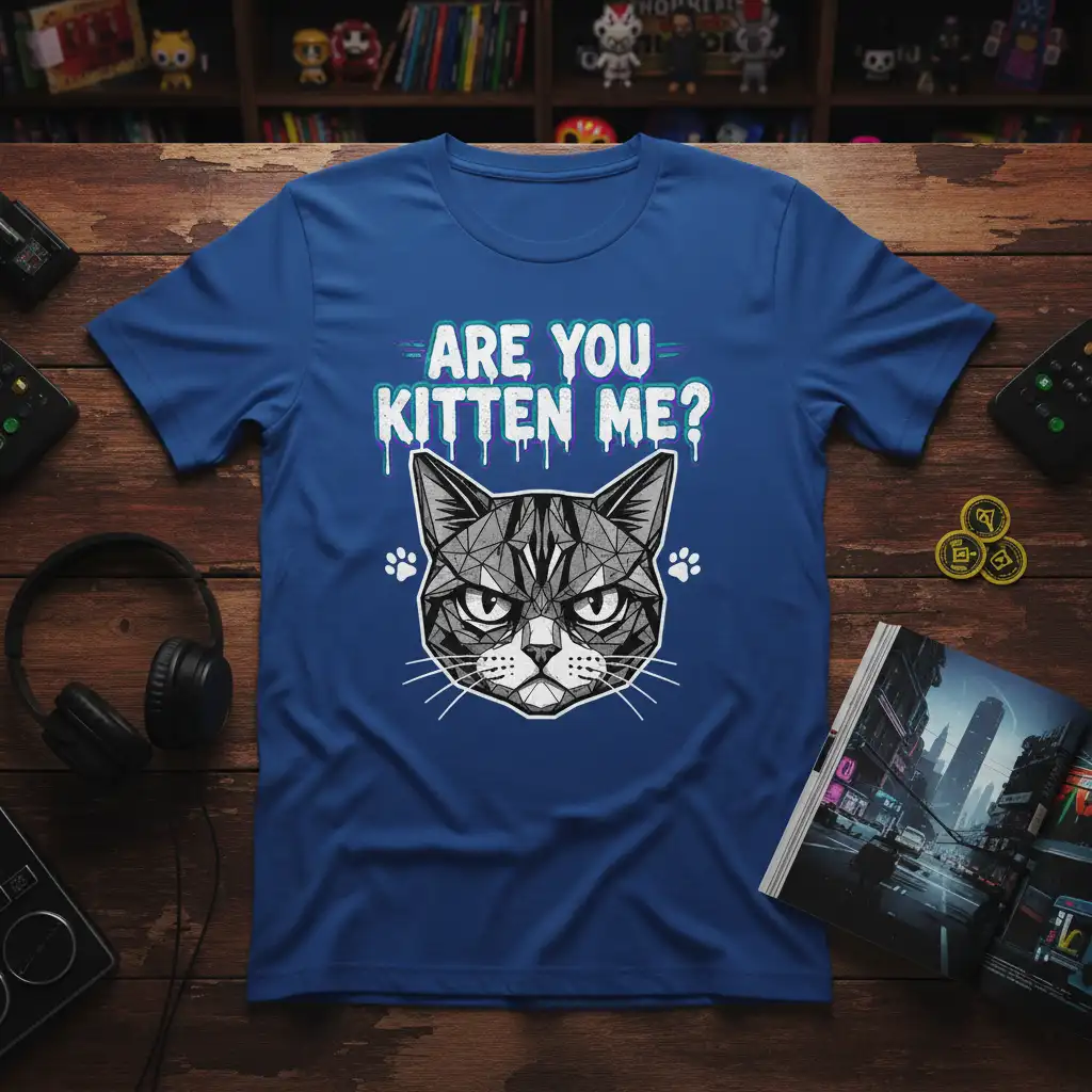 ARE YOU KITTEN ME? This phrase, boldly displayed on this unique t-shirt, perfectly captures the playful and sometimes exasperated sentiment that many cat owners feel. It’s a witty declaration for anyone who adores their feline companions and appreciates a good pun. The design features a striking geometric cat face, exuding a cool, modern vibe that complements the humorous text. This tee is more than just apparel; it’s a conversation starter and a badge of honor for true cat lovers. Embrace your inner cat parent and let the world know your feelings with this eye-catching and comfortable garment.