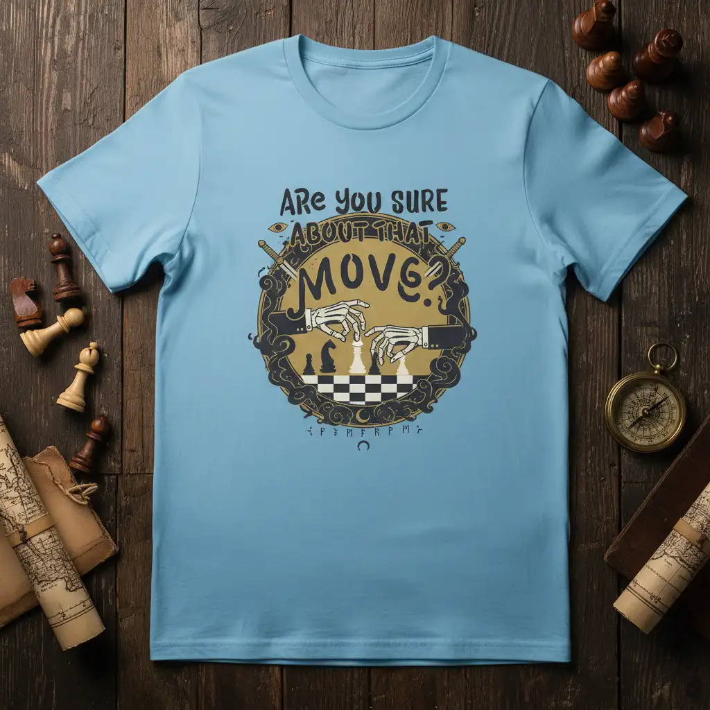 This unique tee features the captivating quote “Are you sure ABOUT THAT MOVE?” making it an instant hit among chess players and strategy game aficionados. The striking visual elements, including skeleton hands poised over a chessboard, add a dramatic flair. It’s designed for those who appreciate the deeper tactical elements of chess and enjoy a bit of dark humor.