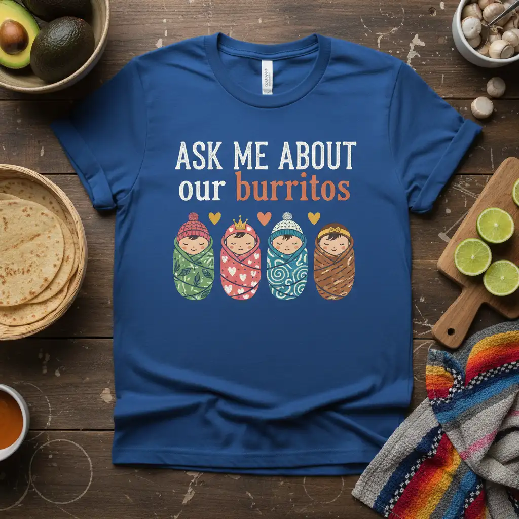 This unique t-shirt proudly displays the catchy phrase “ASK ME ABOUT our burritos,” accompanied by adorable illustrations of swaddled babies. Each baby is wrapped in a different cozy pattern, complete with a little hat, making them look like miniature culinary delights. The design is printed on a high-quality fabric that ensures both comfort and durability, perfect for everyday wear or special occasions. It’s more than just a shirt; it’s a conversation starter and a badge of honor for proud parents.