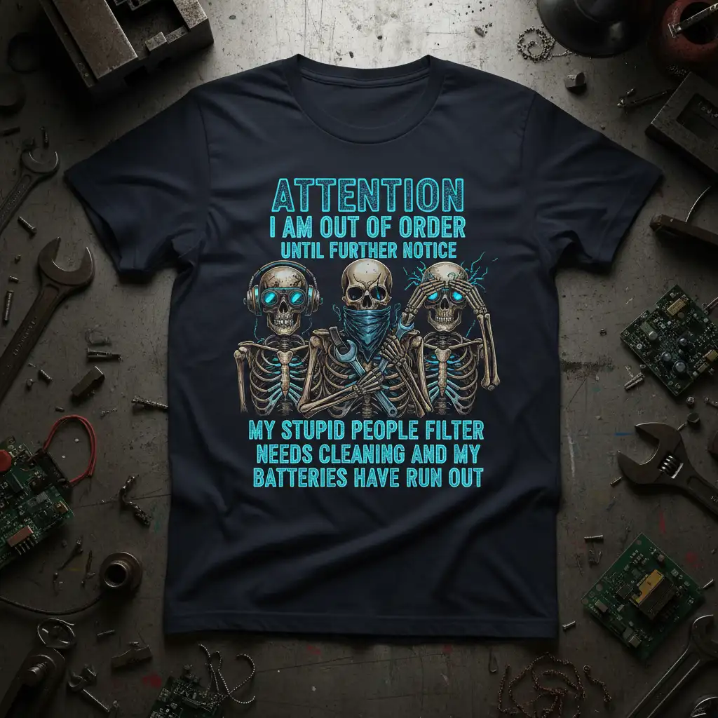 ATTENTION I AM OUT OF ORDER UNTIL FURTHER NOTICE MY STUPID PEOPLE FILTER NEEDS CLEANING AND MY BATTERIES HAVE RUN OUT is more than just a phrase; it’s a relatable declaration for anyone who’s ever felt overwhelmed or simply needed a moment of peace. This t-shirt captures that sentiment perfectly, combining a witty quote with a striking visual design that’s sure to turn heads and spark conversations. It’s designed for those who appreciate humor in everyday life, especially those in technical or repair fields who understand the struggle of maintenance and the need for downtime.