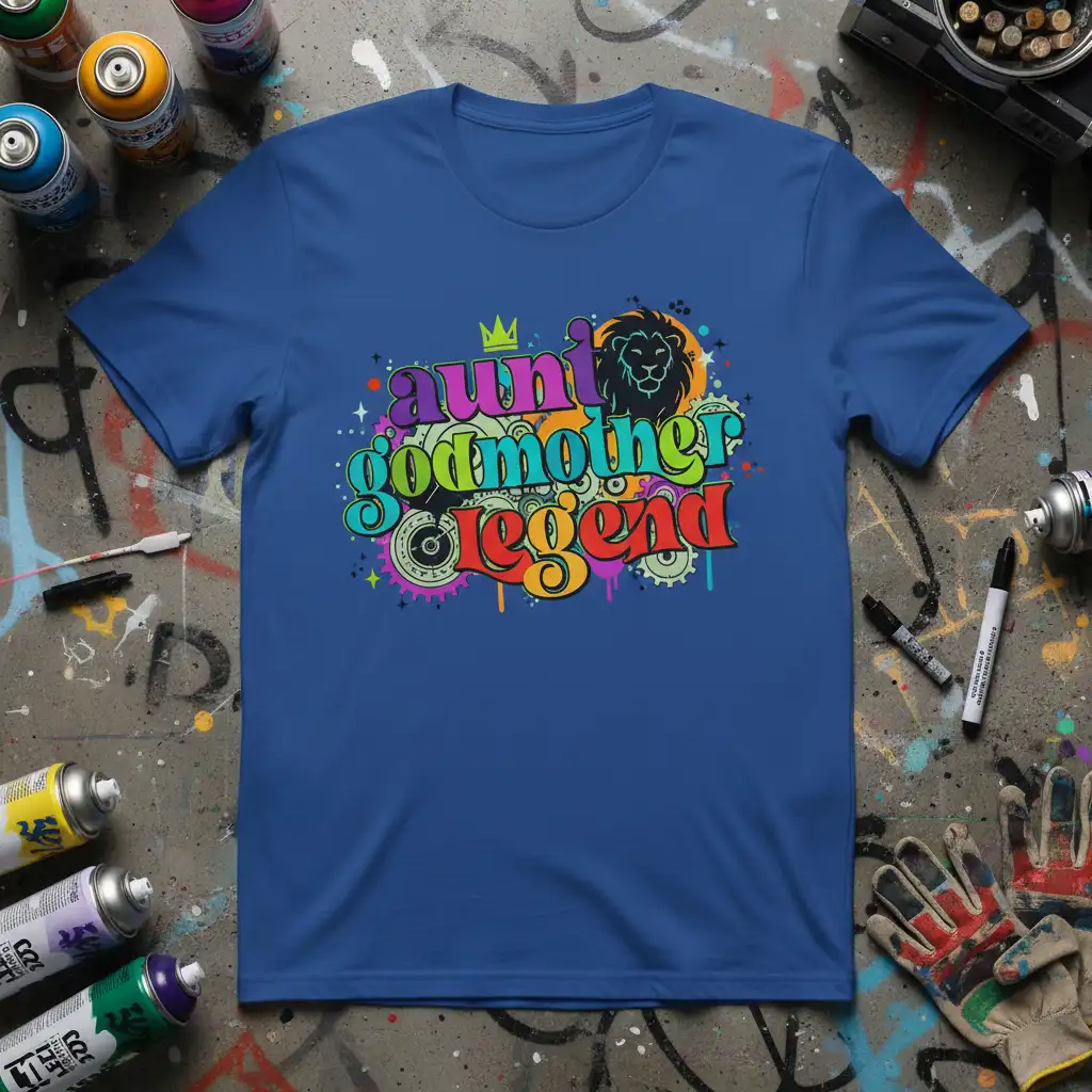 The design features bold, colorful lettering that pops, making it a real head-turner. Accompanying the text is a regal lion graphic and a subtle crown, symbolizing strength, leadership, and royalty – qualities often embodied by amazing aunts and godmothers. The overall aesthetic is energetic and modern, appealing to those who appreciate unique and expressive fashion. It’s a wearable piece of art.