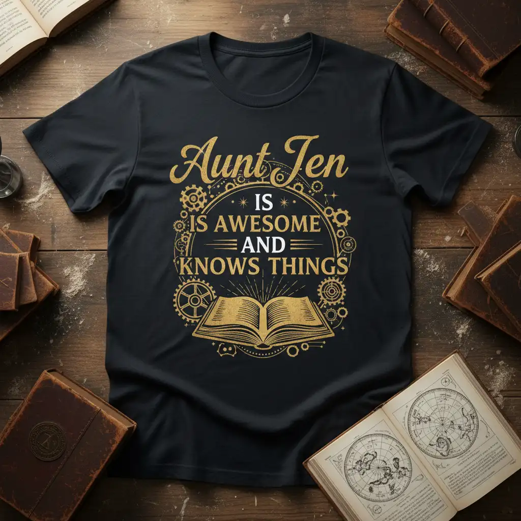 The design itself is a conversation starter, subtly hinting at the aunt’s impressive intellect and captivating personality. The ‘Aunt Jen is Awesome and Knows Things’ quote, combined with the symbolic imagery, creates a powerful statement of admiration. It’s a versatile piece that can be styled in various ways, making it suitable for casual outings or relaxed family events, always making a positive impression.