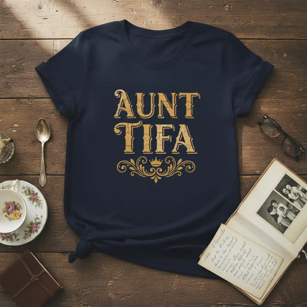 Beyond its sentimental value, the AUNT TIFA shirt boasts a unique aesthetic that stands out. The distressed golden lettering combined with the ornate scrollwork and crown creates a look that is both sophisticated and subtly playful. This design ensures that the wearer feels special and recognized, whether she’s out with friends or enjoying a quiet day at home.