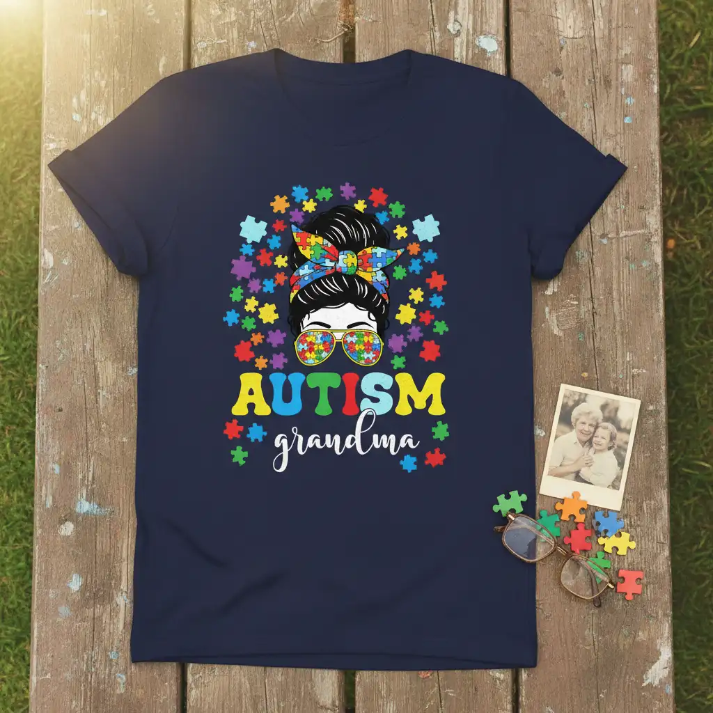 The centerpiece of this design is the bold “AUTISM grandma” text, presented in a dynamic font that stands out. Complementing this are the striking sunglasses worn by the graphic woman, their lenses filled with the distinctive puzzle pattern. This detail adds a touch of cool confidence and a clear visual tie to the autism advocacy theme, making the design both fashionable and meaningful.