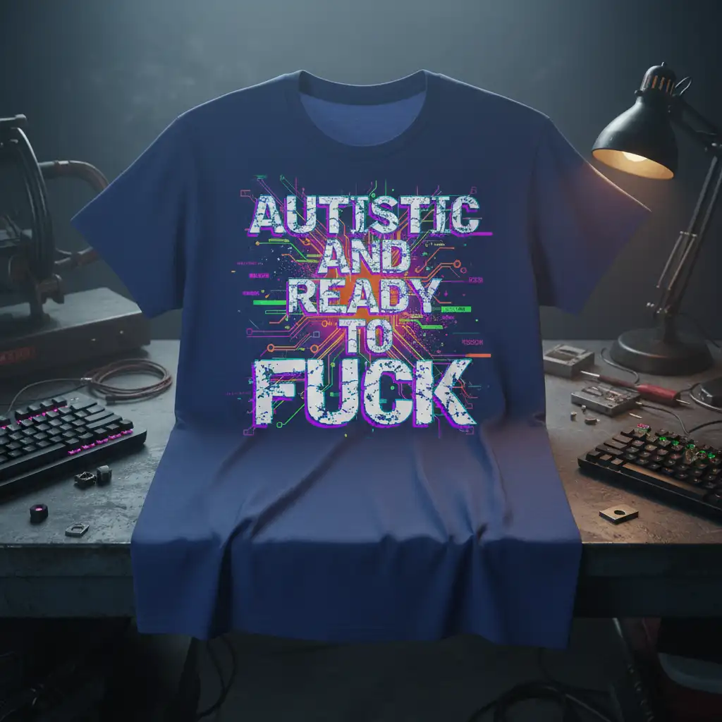 Pick from Black, Navy, Royal, Dark Heather, Red, and White to match your mood and wardrobe staples. Each colorway keeps the AUTISTIC AND READY TO FUCK design clear and photo-ready for everyday wear.