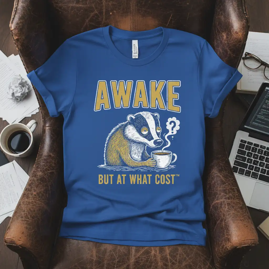 This unique tee features a charmingly exhausted badger clutching a steaming mug of coffee, a visual representation of the morning battle. The phrase “AWAKE BUT AT WHAT COST™” is emblazoned above and below the artwork in bold, eye-catching lettering. It’s a humorous nod to the sacrifices we make for alertness, resonating deeply with coffee enthusiasts everywhere.