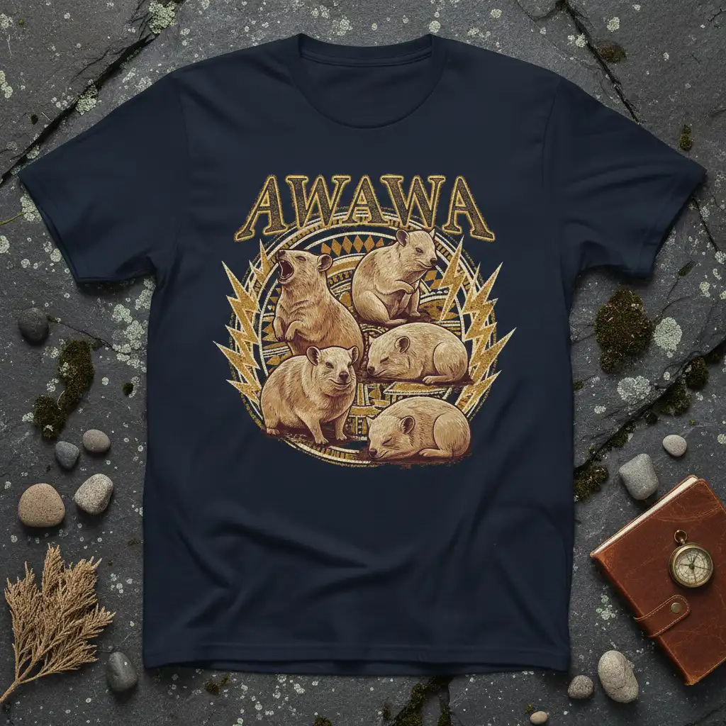 This design isn’t just about a cute animal; it’s about embracing positivity and joy. The “AWAWA” text and the energetic design elements combine to create a feeling of happiness and lightheartedness. It’s perfect for anyone looking to add a touch of fun and whimsy to their wardrobe. The vibrant golden accents against the dark t-shirt create a striking contrast that ensures the design pops.
