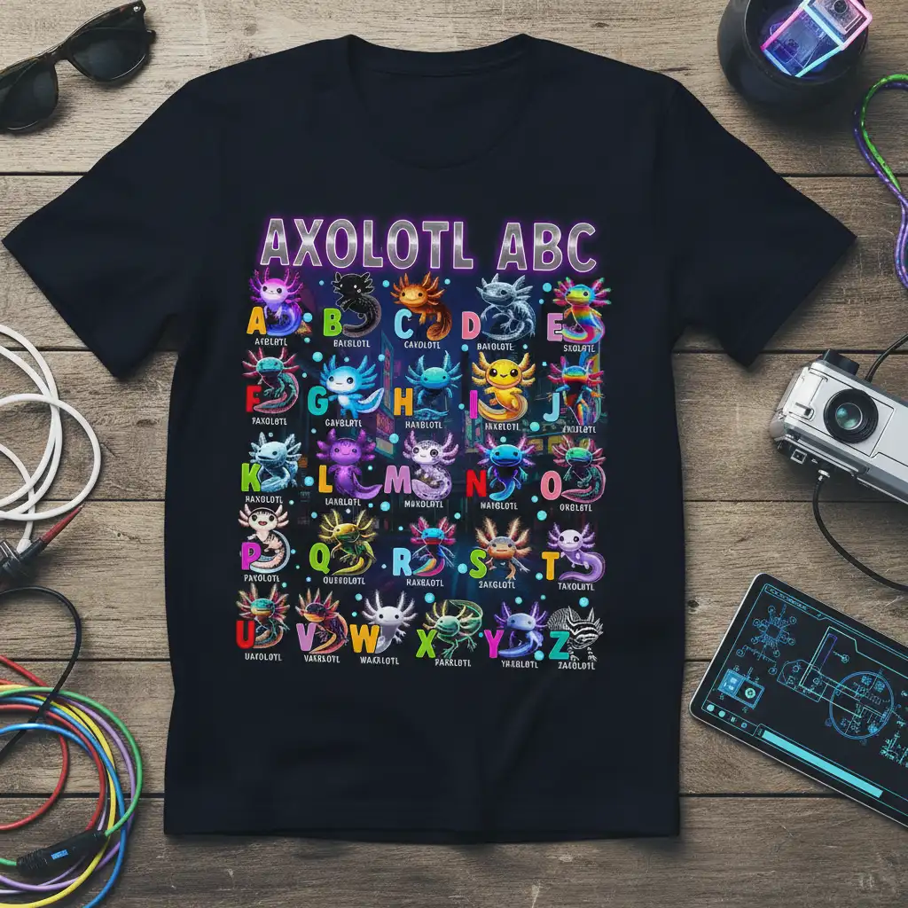 The versatility of the Axolotl ABC design means it appeals to a broad audience, from young learners fascinated by animals to adult collectors of unique graphic tees. It’s a gift that keeps on giving, offering smiles and compliments whenever it’s worn. Make someone’s day special with this memorable and endearing axolotl-themed t-shirt.