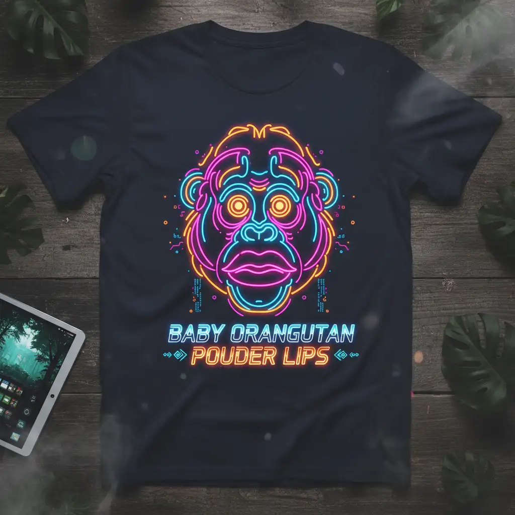 The phrase “Baby Orangutan Pouder Lips” itself is playful and memorable, perfectly complementing the whimsical nature of the neon graphic. This t-shirt is designed to be a conversation starter, showcasing your appreciation for unique aesthetics and the natural world. Whether you’re heading out for a casual day or looking for a fun gift, this tee delivers on style and originality.