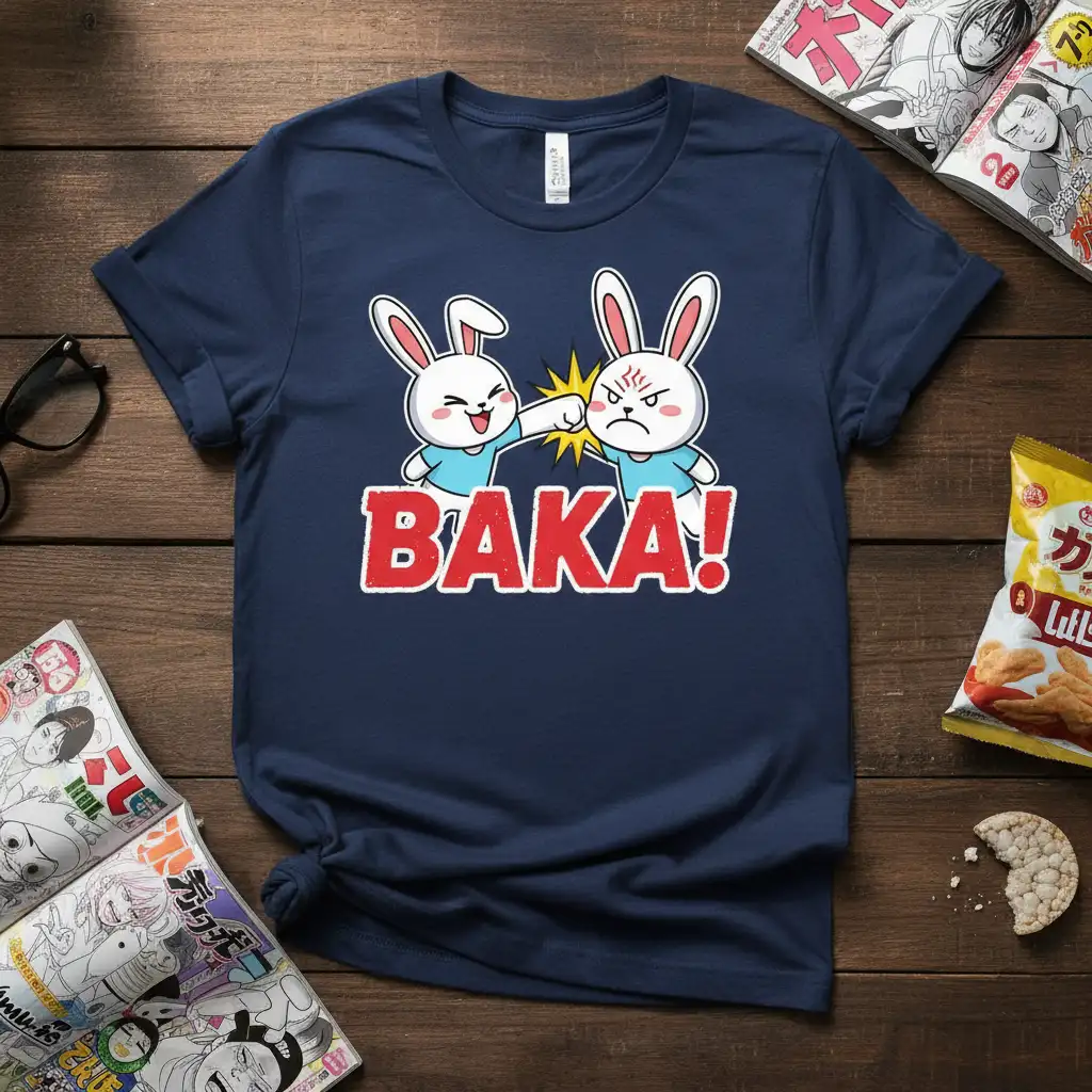 The “Baka!” design is a nod to the expressive and often exaggerated characters found in anime and manga. Whether you’re attending conventions, hanging out with friends, or simply lounging at home, this t-shirt offers a unique way to showcase your fandom. The visual contrast between the two bunnies—one seemingly amused and the other clearly annoyed—adds a layer of comedic depth to the design, making it instantly relatable to fans of humorous content.