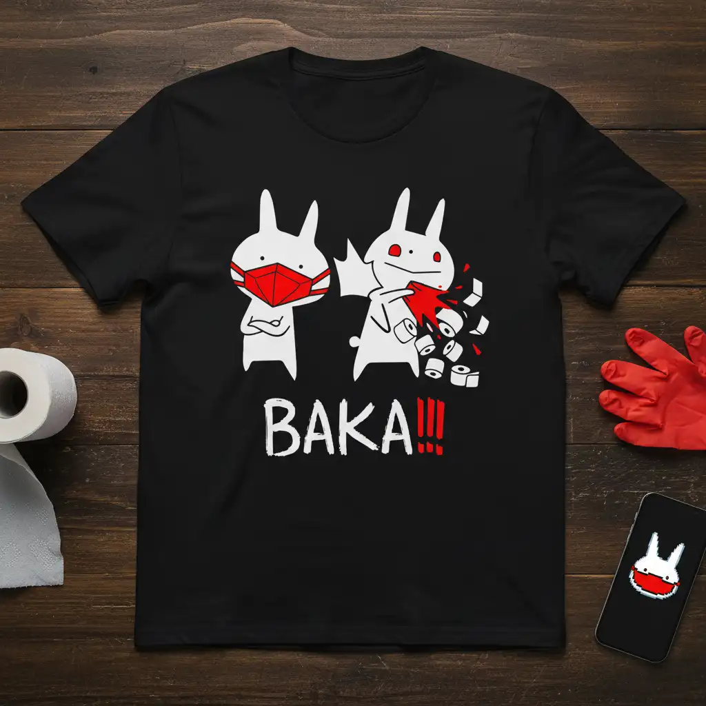 The Baka!!! T-Shirt is a standout choice for anyone looking to inject some fun and personality into their wardrobe. Its unique design features distressed anime-style bunnies, one sporting a mask and the other in a comical, messy situation involving toilet paper. The bold, impactful “BAKA!!!” text reinforces the humorous and slightly outrageous theme of the graphic.