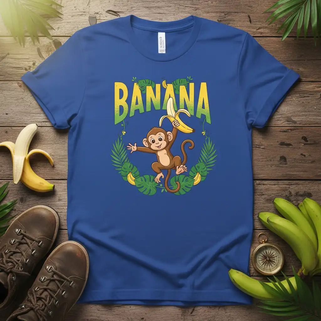 Pick from Black, Navy, Royal, Dark Heather, Red, and White to match your mood and wardrobe staples. Each colorway keeps the Banana Monkey T-Shirt design clear and photo-ready for everyday wear.