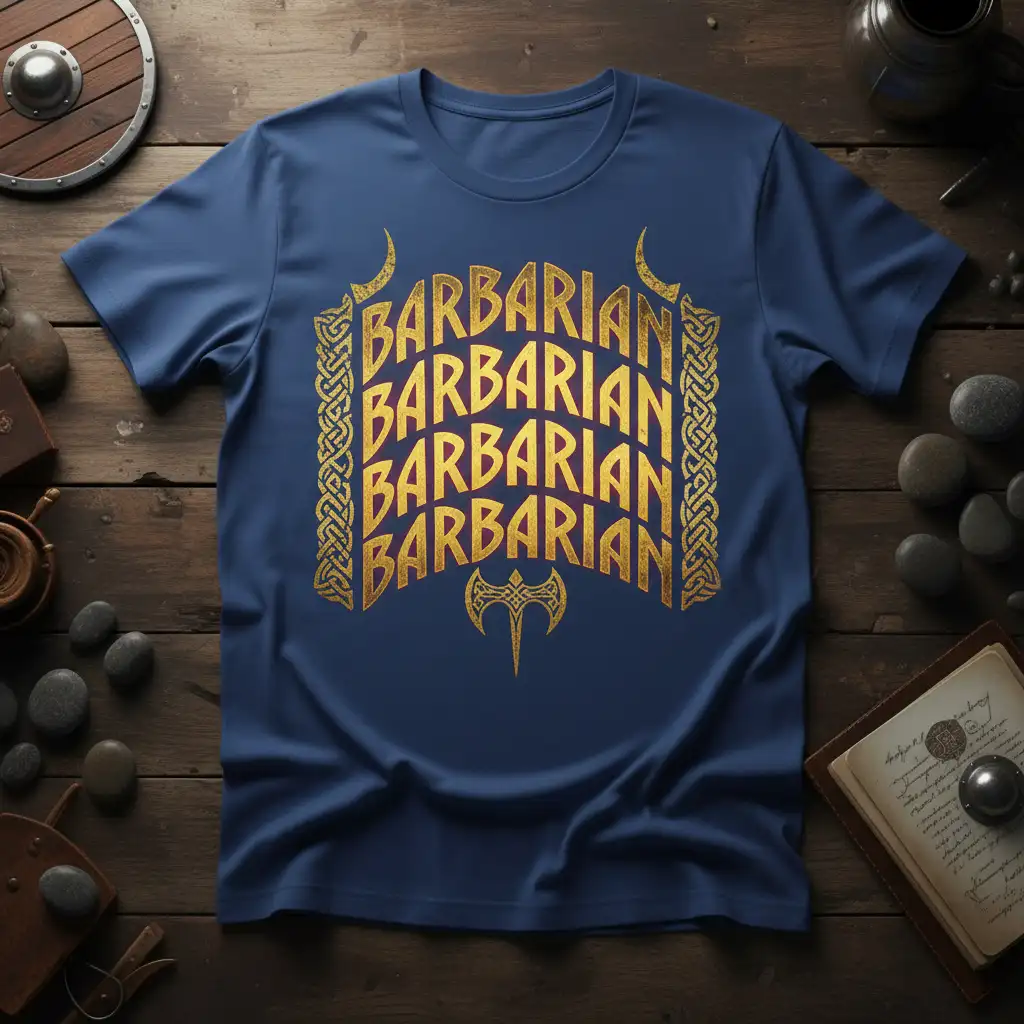 This distinctive graphic tee showcases the word “BARBARIAN” repeated in a powerful, stylized golden font, creating a visually impactful design. The text is framed by intricate, knotwork borders, evoking the rich artistry of Viking and Nordic cultures. Subtle crescent moons arch over the design, adding a touch of mystique, while a formidable axe emblem rests below, symbolizing combat prowess and ancient might.