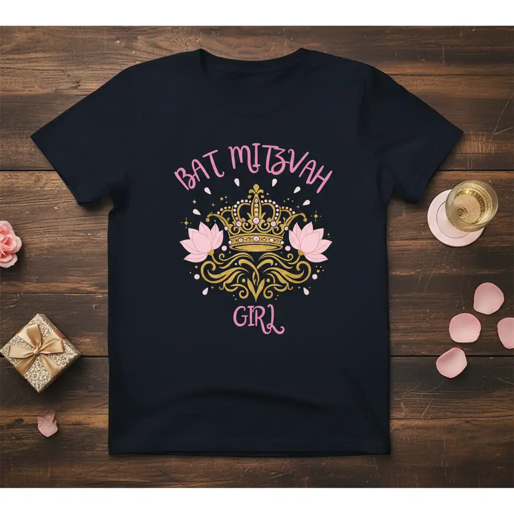 The design prominently displays “Bat Mitzvah Girl” in a beautiful pink script font. Above this text sits a majestic gold crown, symbolizing royalty and the importance of this occasion. Flanking the crown are delicate pink lotus flowers, adding a touch of elegance and serenity to the overall aesthetic. Small sparkling accents surround the central motif, giving the design a festive and celebratory feel.
