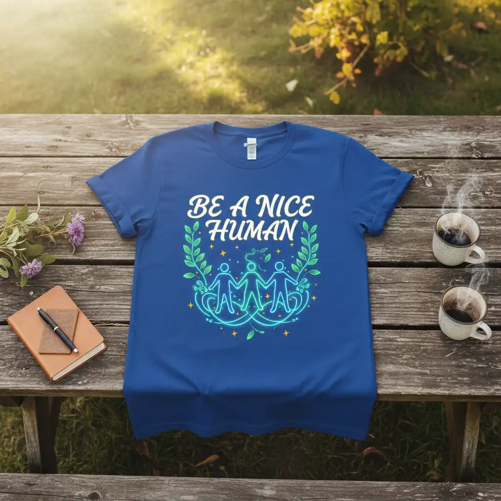 The “Be A Nice Human” tee is more than just apparel; it’s a wearable affirmation. It’s perfect for those who actively seek to create a more positive environment, whether at work, with friends, or within their community. The design’s aesthetic is both uplifting and stylish, making it a versatile addition to any casual outfit. It’s a gentle nudge to yourself and others to choose kindness in every situation.