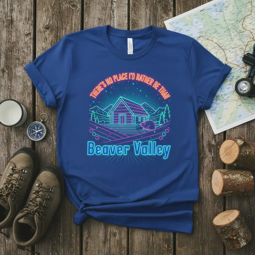 The neon-inspired graphic on this t-shirt offers a unique and eye-catching aesthetic. The interplay of glowing blues and pinks against the fabric creates a dynamic visual that captures attention. This design is not only stylish but also serves as a constant reminder of your favorite place, Beaver Valley.