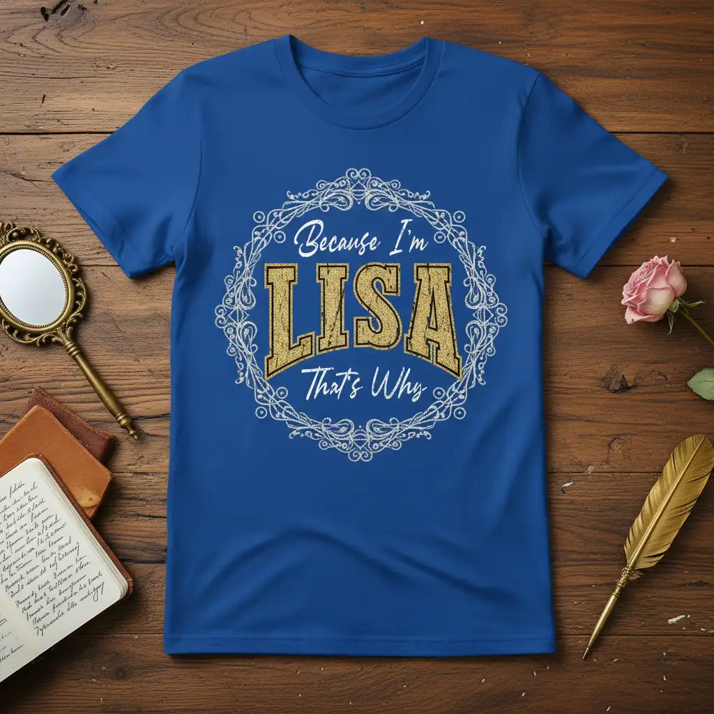 This distinctive t-shirt features the full quote “Because I’m LISA That’s Why,” prominently displayed within an elegant, decorative white frame. The central focus is the name “LISA,” rendered in a luxurious, glittery gold font that catches the light and adds a touch of glamour. This combination of text and design creates a memorable and personalized piece that resonates with anyone who proudly carries the name Lisa.