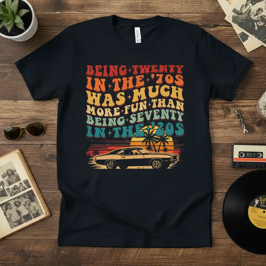 The visual appeal of this t-shirt is undeniable, featuring a retro color palette of warm oranges, yellows, and teals, set against a deep navy background. The text “BEING TWENTY IN THE ’70S WAS MUCH MORE FUN THAN BEING SEVENTY IN THE ’20S” is presented in a dynamic, layered font that’s both eye-catching and stylish. Below the text, a classic muscle car cruises along a beach scene at sunset, complete with palm trees, creating a complete picture of 1970s cool. This detailed graphic ensures the design stands out and appeals to those who appreciate intricate retro artwork.