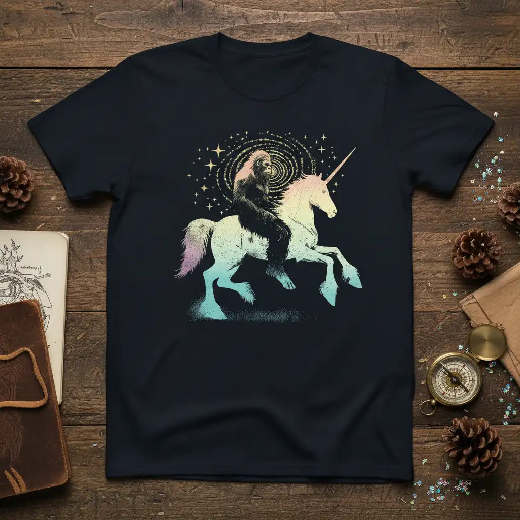Bigfoot Riding Unicorn through a cosmic wonderland on this uniquely designed t-shirt. This captivating graphic tee brings together two of the most intriguing mythical figures in a way that sparks imagination and humor. It’s perfect for anyone who appreciates the quirky, the fantastical, and the slightly absurd side of life. This shirt is more than just apparel; it’s a statement piece that celebrates the joy of the unexpected and the thrill of adventure beyond the ordinary. Get ready to turn heads and start conversations with this extraordinary design.