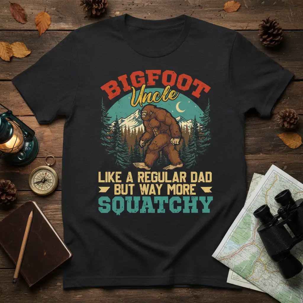 BIGFOOT Uncle LIKE A REGULAR DAD BUT WAY MORE SQUATCHY apparel is designed for the legendary uncle who brings a unique blend of adventure and humor to every family gathering. This shirt captures the spirit of that special uncle, the one who’s more than just a regular dad – he’s delightfully squatchy. It’s the perfect way to celebrate his distinct personality and the memorable moments he creates. This design is a fantastic gift for birthdays, holidays, or just to show appreciation for the coolest uncle around. Embrace the myth and the fun with this eye-catching piece.