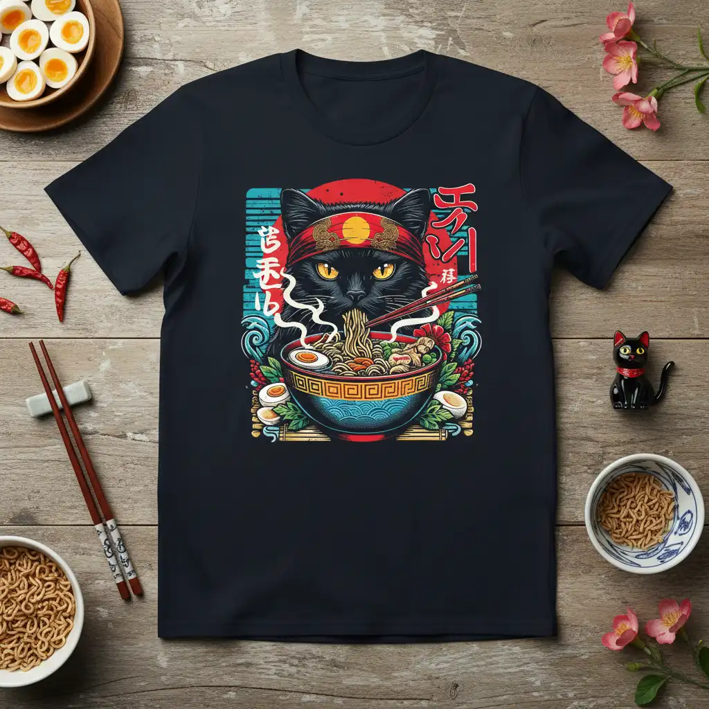 This striking design showcases a black cat, sporting a vibrant red bandana, intently enjoying a hearty bowl of ramen. The intricate details, from the steaming noodles to the traditional Japanese motifs surrounding the bowl, create a visually captivating scene. It’s a perfect representation of the joy found in good food and the quiet companionship of our feline friends. The artwork is rendered in a style that appeals to fans of anime and Japanese aesthetics, making it a truly special graphic tee.