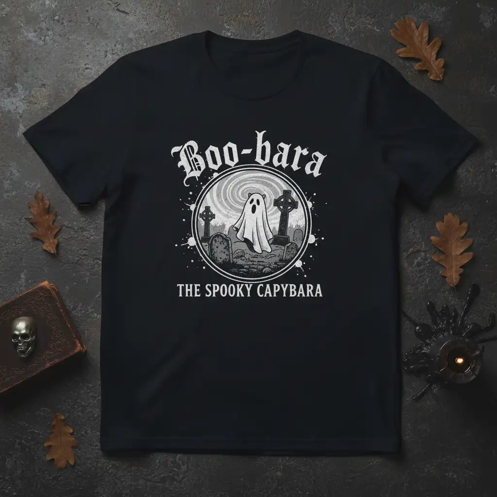 The “Boo-bara” element of the design playfully hints at the capybara’s role in this spooky scene, creating a memorable and unique pun. This clever wordplay is sure to resonate with those who appreciate witty and imaginative graphics. The overall composition is balanced and visually engaging, ensuring that the design stands out on any garment.