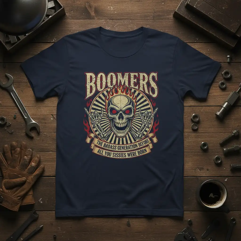 This unique t-shirt design pays homage to the Boomer generation with a powerful and humorous message. Featuring a retro-inspired graphic with a skull and flames, it exudes a cool, rebellious vibe. It’s designed for those who resonate with the idea of being part of a generation that set the standard for toughness and independence.