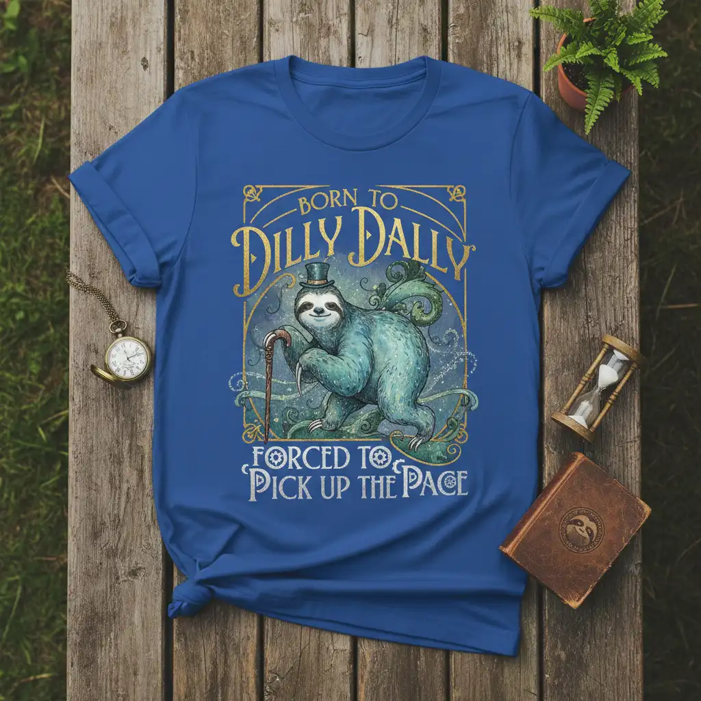 This eye-catching t-shirt features a delightful illustration of a sloth, complete with a distinguished top hat and a classic cane, embodying the very essence of “dilly dallying.” The artwork is set within an ornate, art nouveau-inspired frame, adding a touch of vintage elegance to the design. The prominent text “Born to Dilly Dally” sits proudly at the top, while “Forced to Pick Up the Pace” adds a humorous counterpoint at the bottom. It’s a wearable piece of art that speaks volumes about personality and perspective.
