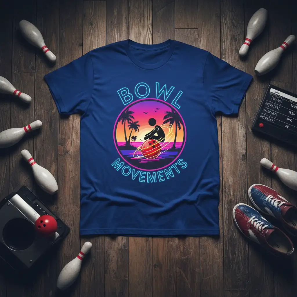 The artwork expertly blends a tropical sunset theme with the intensity of a bowling strike. Palm trees frame the scene, suggesting a relaxed, vacation-like atmosphere that contrasts with the focused action of the bowler. The stylized representation of the bowling ball in motion adds a dynamic visual element, emphasizing the ‘movements’ aspect of the design. This unique composition makes the t-shirt a standout piece for any fan of retro graphics and sports themes.