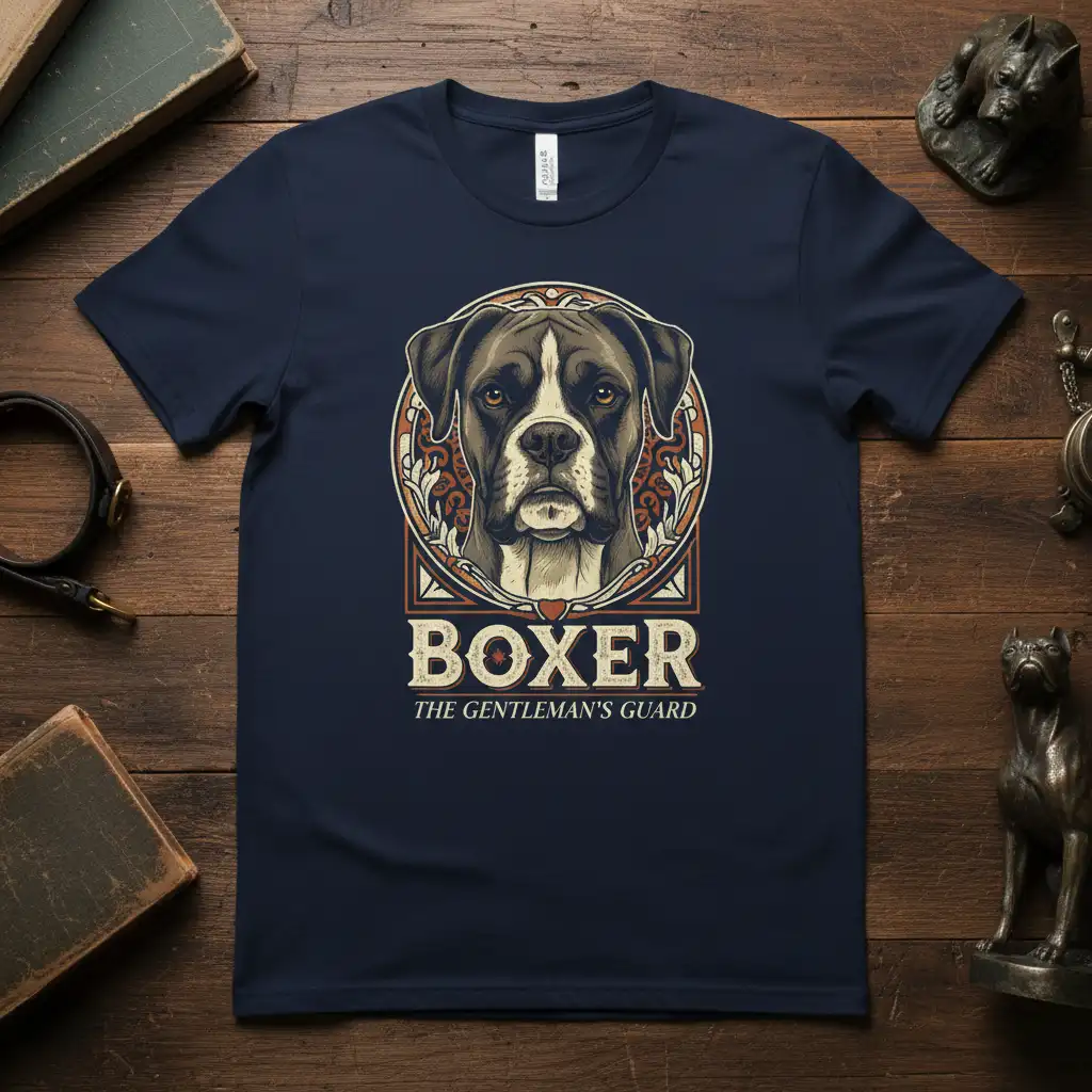This unique design showcases the dignified presence of a Boxer, embodying the phrase “The Gentleman’s Guard.” The artwork is detailed, highlighting the breed’s distinctive features and expressive eyes. The typography is carefully chosen to complement the image, creating a vintage yet sophisticated aesthetic that appeals to true dog lovers.