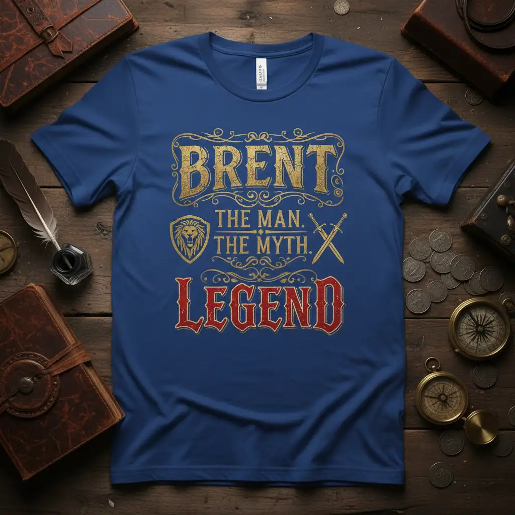 This BRENT THE MAN. THE MYTH. LEGEND design proudly displays “BRENT” in eye-catching golden font, immediately personalizing the statement. Below, the classic adage “THE MAN. THE MYTH.” is presented, accompanied by symbolic graphics of a lion and crossed swords, evoking strength and valor. The word “LEGEND” stands out in distressed red, completing the powerful message.