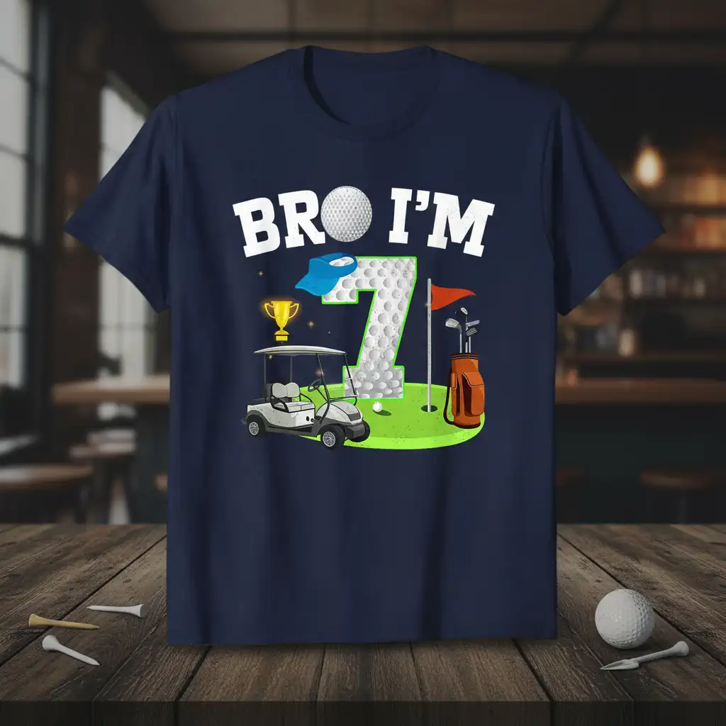 This shirt is designed specifically for boys turning seven who have a passion for golf. The “Bro I’m 7” slogan is fun and relatable, making it a cool addition to their wardrobe. The detailed graphics bring the golf course to life, creating an immersive visual experience that any golf-loving kid will appreciate. It’s a unique way to celebrate their special day and their favorite sport.