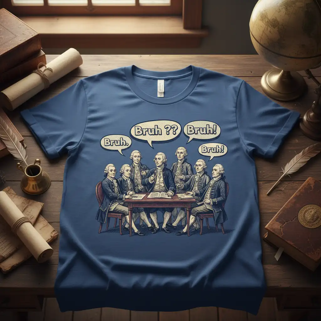 Bruh Bruh Bruh Bruh is the ultimate statement for anyone who loves history with a modern, humorous twist. This unique t-shirt design features a comical take on historical figures, likely the Founding Fathers, depicted in a relatable, meme-worthy scenario. It’s perfect for sparking conversations and sharing a laugh with friends, blending educational appreciation with contemporary internet culture. The design captures that perfect moment of bewildered or questioning exasperation, making it an instant favorite for those who appreciate witty commentary and a touch of the absurd in their wardrobe.