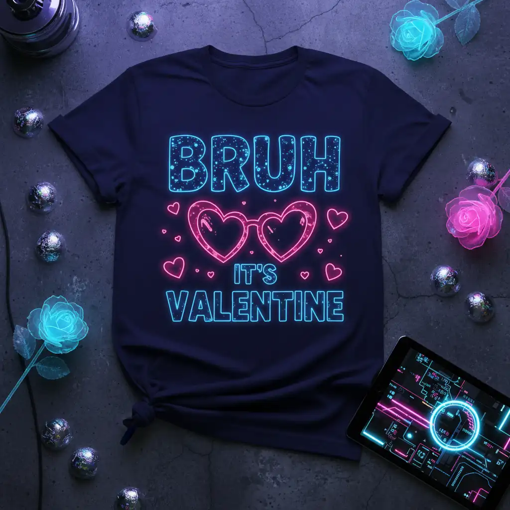 The graphic features “BRUH” and “VALENTINE” in a bright, electric blue, while “IT’S” is rendered in a clean white, all outlined with a playful pink glow. Complementing the text are iconic heart-shaped glasses and scattered smaller hearts, adding a touch of whimsy and unmistakable Valentine’s flair. This combination creates a visually striking and memorable design that is sure to turn heads.